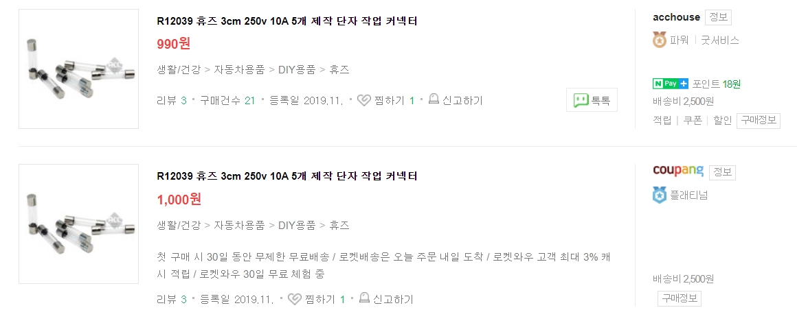 그냥 인터넷 최저가로 구입합니다. 저는 5개 1000원짜리 휴즈를 구입했습니다.
