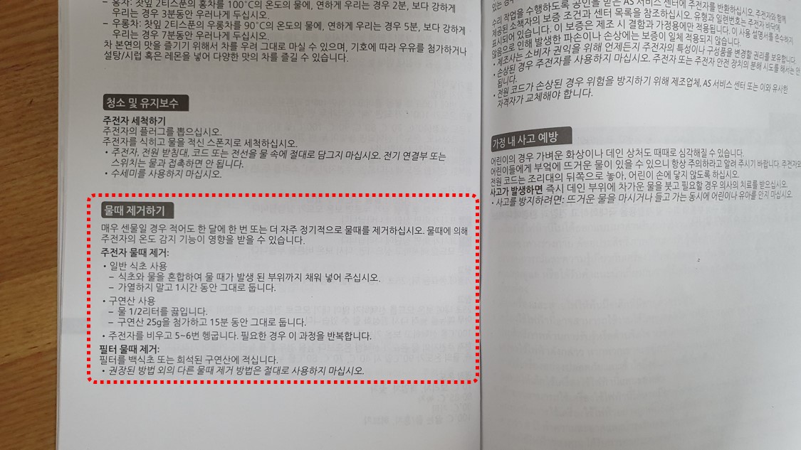 주전자를 사용하면 한달에 한번 이상 정기적으로 물때를 제거해줘야해요.