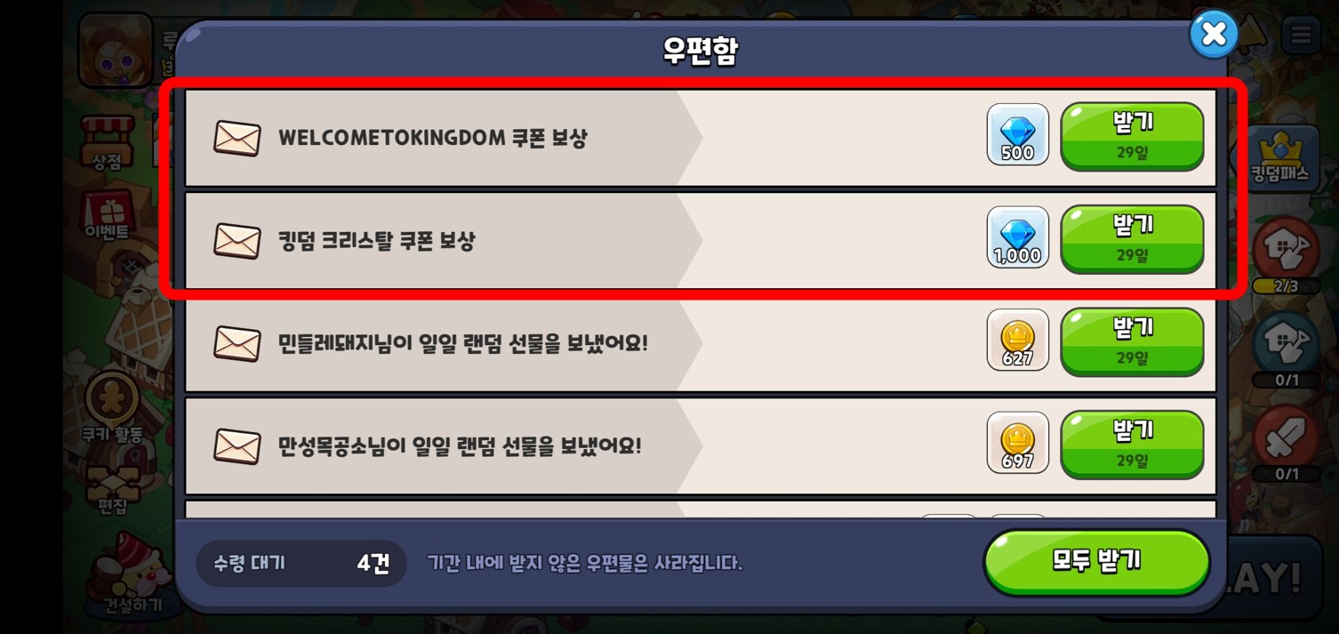 쿠키런 킹덤 쿠폰번호가 존재한다는 사실을 알고 저도 바로 입력해서 리워드를 받았어요.