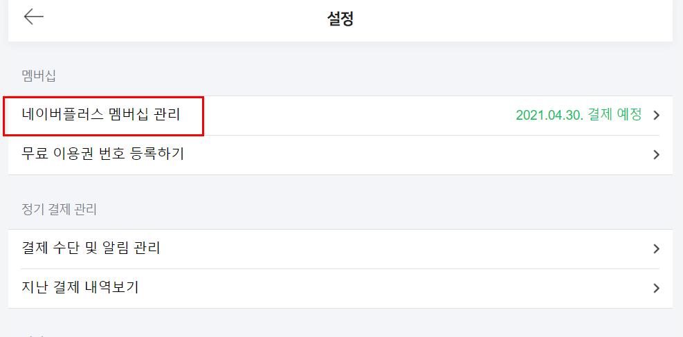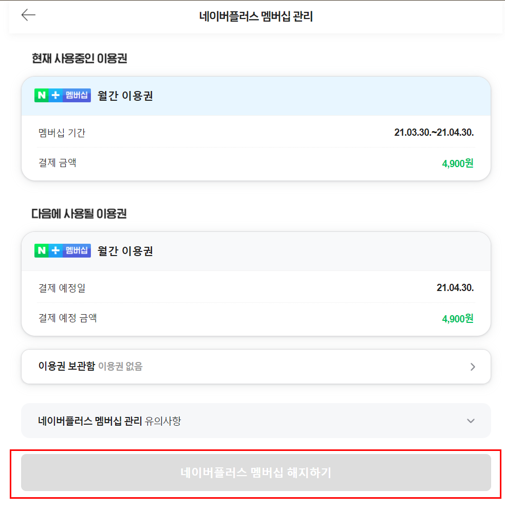 (2) 네이버 플러스 멤버십 관리 버튼을 눌러 해지하기 버튼을 눌러줍니다