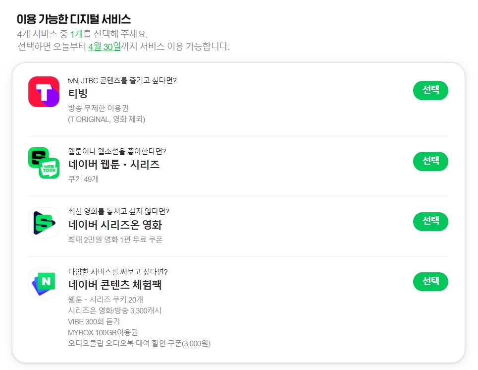 포인트 적립보다 더 매력적인건 매달 제공되는 디지털 서비스 이용권인데요.