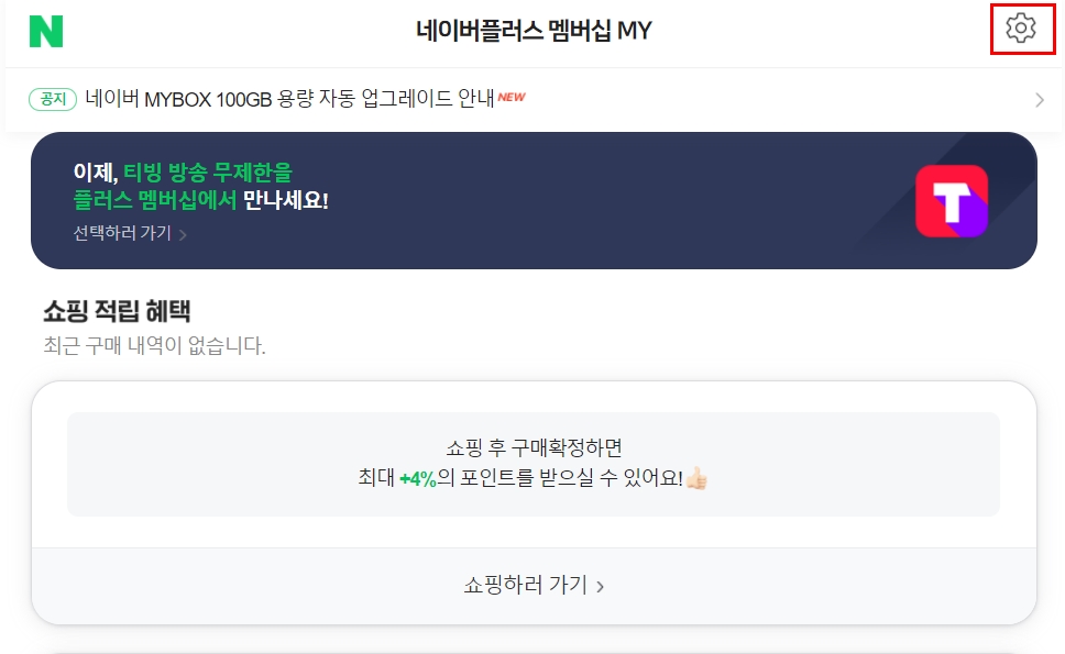 (1) 네이버 로그인 후 > 네이버 플러스 멤버십 화면에서 > 톱니바퀴모양 설정 화면을 클릭해주세요