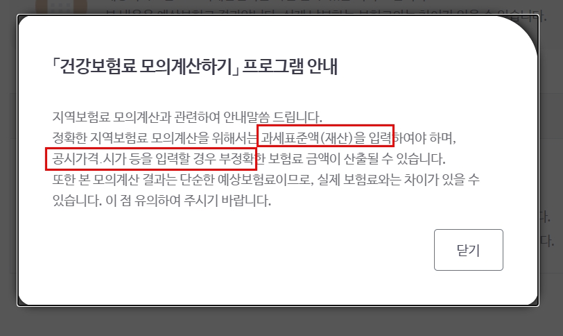 지역보험료 모의계산과 관련하여 안내말씀 드립니다. 정확한 지역보험료 모의계산을 위해서는 과세표준액(재산)을 입력하여야 하며, 공시가격․시가 등을 입력할 경우 부정확한 보험료 금액이