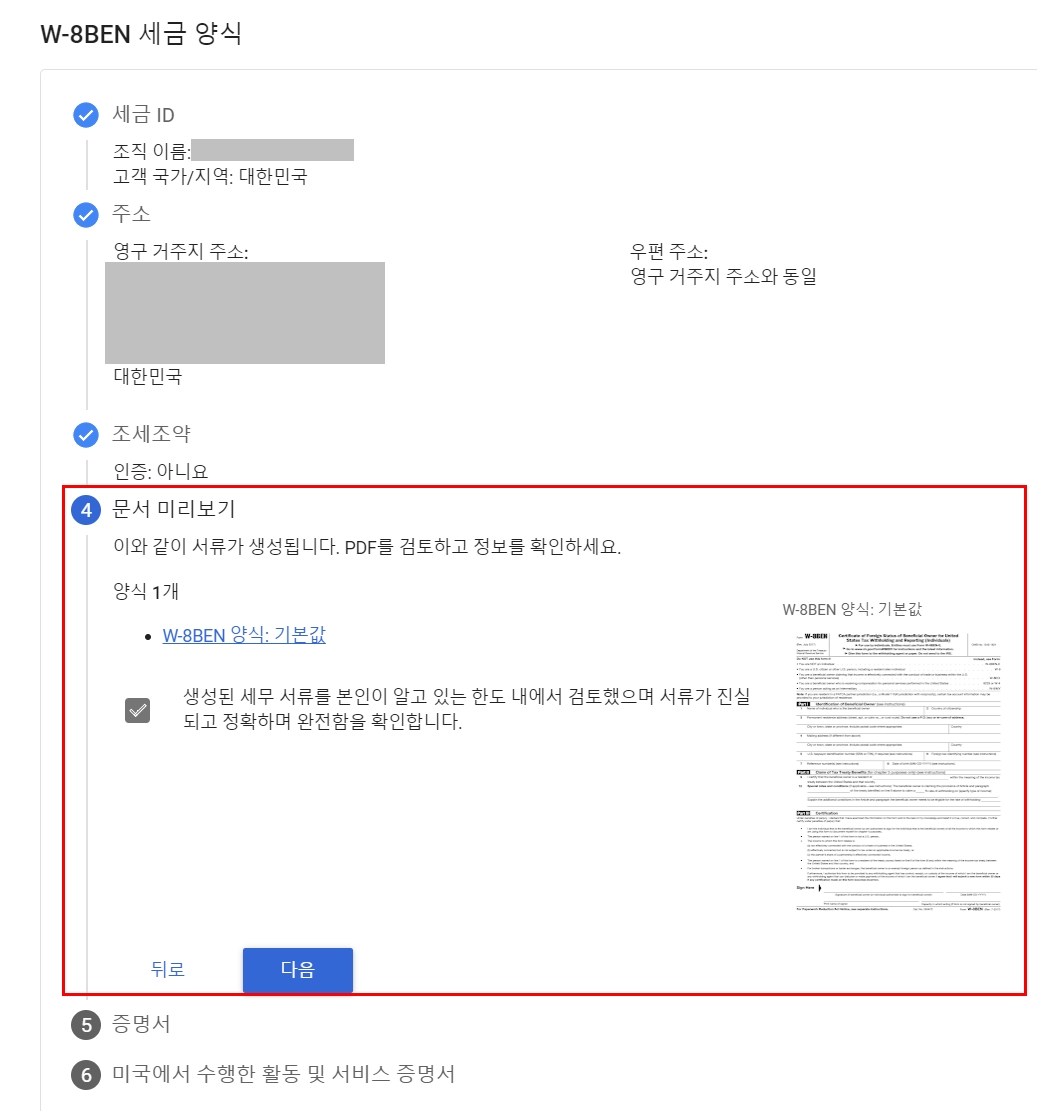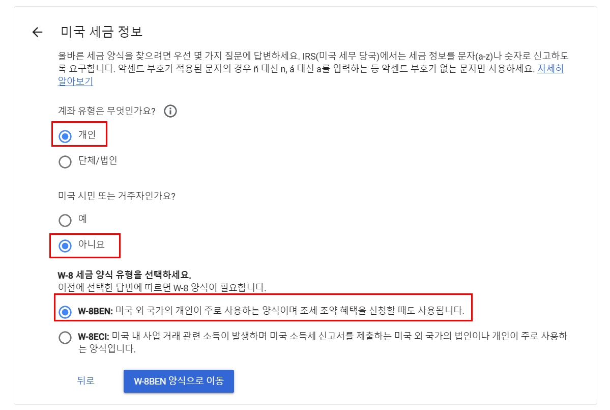 미국 외 대한민국에서 주로 수입이 발생하기 때문에 W-8BEN 양식을 선택합니다. 여기까지 참 간단하네요.