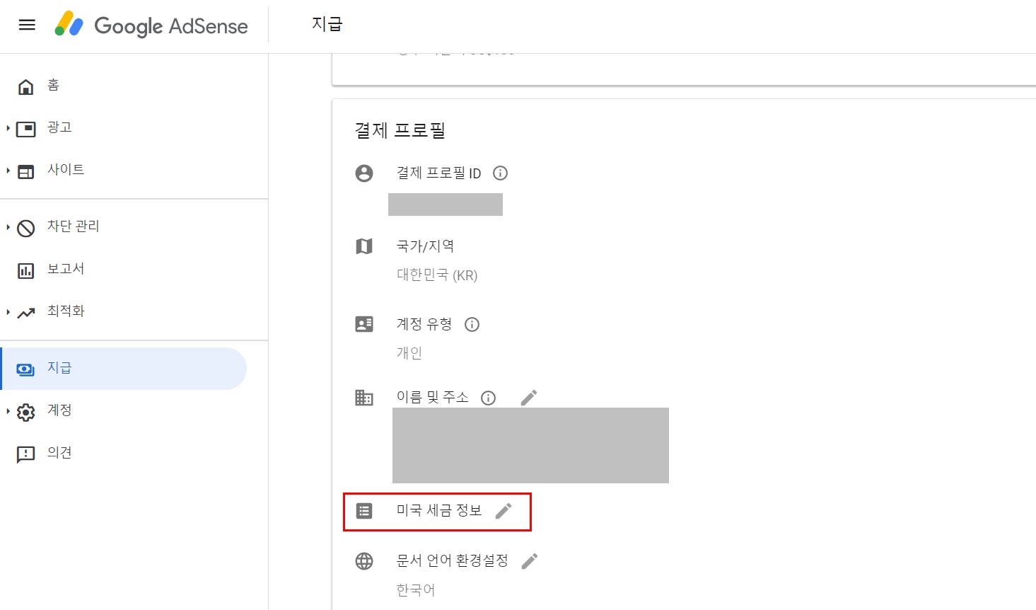 1. 애드센스 홈화면에서 지급 > 설정관리 > 미국 세금 정보를 클릭합니다.