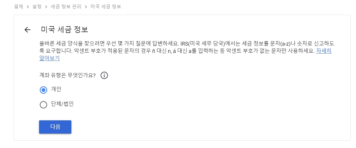 3. 미국 세금 정보에 개인인지 단체/법인인지 클릭합니다.
