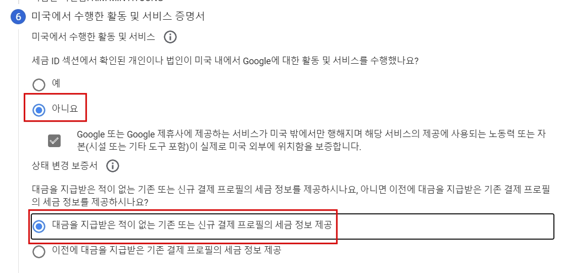 저는 미국내 구글에 대한 활동 및 서비스를 수행한적이 없으므로 아니오를 체크했어요.