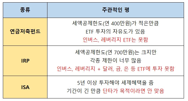 연금저축펀드나 IRP와 달리 레버리지나 인버스 ETF에 투자가 가능해서 활용도가 더 많습니다.