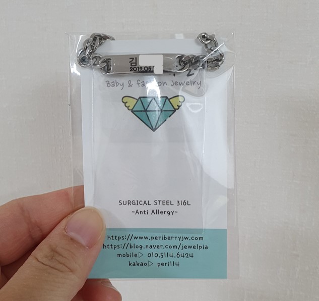 저희 아이는 4mm 짜리 써지컬스틸 미아방지 팔찌를 쓰고 있는데요. 아이 팔목에 4mm는 적당한 사이즈인데 뒷면에 핸드폰 번호가 잘 안보이더라구요. 혹시 할아버지, 할머니자 저희 아이를 맡게 될 수도 있겠다 싶어 가독성이 좋은 7mm 짜리 미아방지팔찌를 주문했어요.