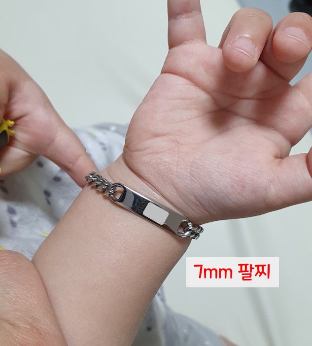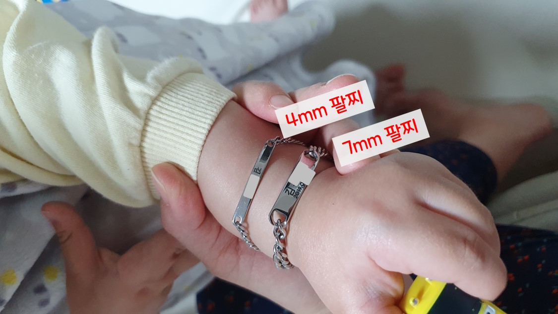팔찌를 채워 놓고 보니 당연히 7mm가 아이 이름도 크게 잘 보이고 좋더라고요. 그런데 너무 무거워요. 처음 팔찌를 받았고 들어봤을때 묵직한 무게에 좀 놀랐어요. 얇은 아이 팔목에 무거운 팔찌를 채우려니 아직은 좀 이르단 생각이 드네요. 갓 말을 하기 시작한 저희 아이에게 7mm 짜리 팔찌를 채워주니 "무거워요" 말하네요. 당분간은 어쩌면 몇년동안은 4mm 짜리 팔찌를 사용하려구요.