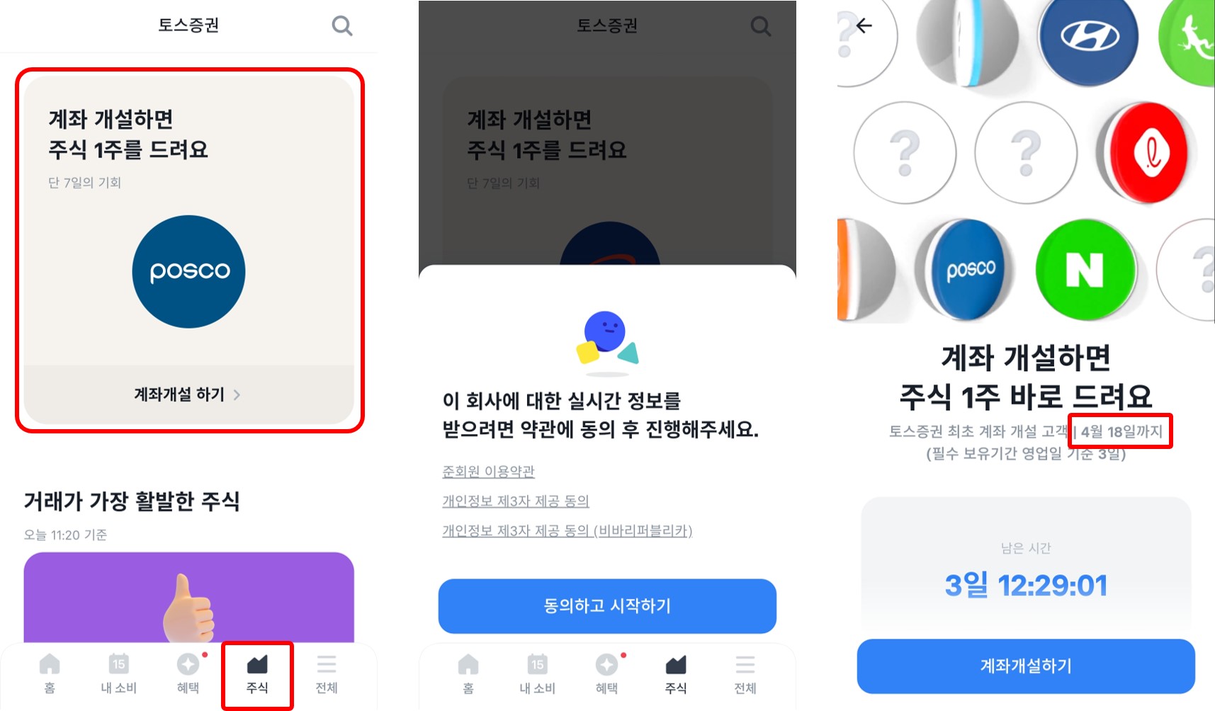 저도 서둘러 토스 어플을 실행했는데요. 주식을 탭하고 스크롤을 내리면 계좌개설 시 주식 1주를 더 준다는 이벤트가 나와요. 약관 동의를 하고 계좌 개설하기 버튼을 누르면요.