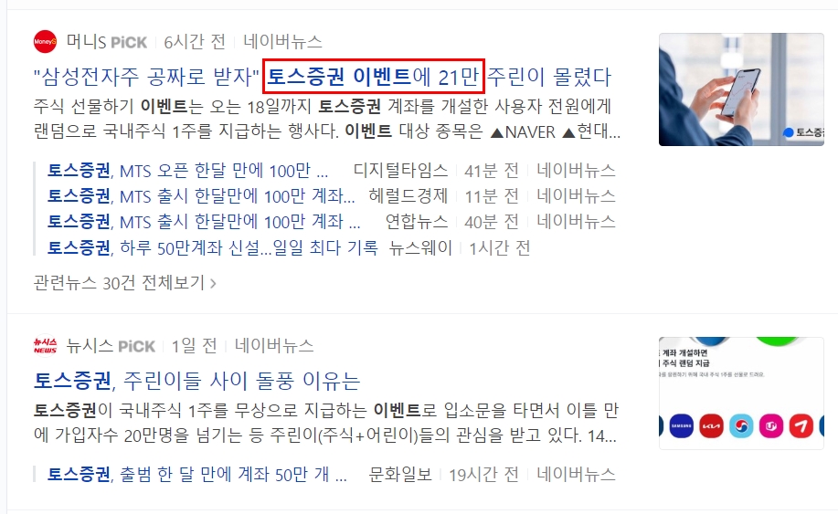 요리조리 검색 해보니 저만 소식을 늦게 알았나봐요. 주식 1주를 랜덤으로 주는 이벤트로 첫 날에만 주식계좌가 13만계좌가 개설되었다고 해요. 또 14일 하루에만 50만좌가 신규 개설되었다고 해요. 타 증권사 하루 최대 계좌 개설 신기록이 5만계좌였는데 토스는 무려 10배의 기록을 세웠네요. 어제에만 50만명이 주식 1주를 받아갔다는 사실! 입소문이 계속 퍼져 접속이 잘 안되나봐요. :(