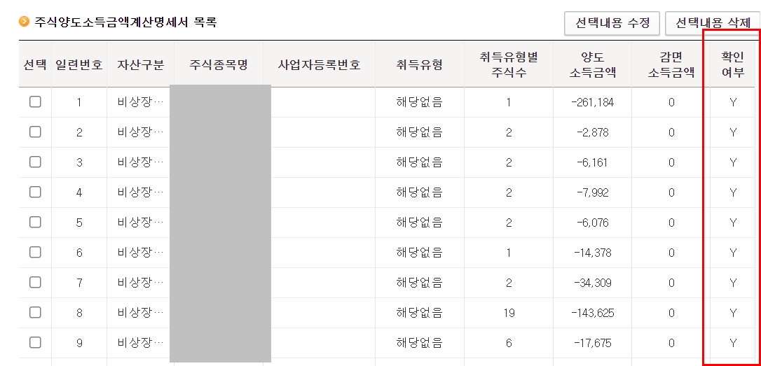 엑셀 시트를 홈택스에 업로드하고 확인여부에 모두 Y로 나와야 다음 항목으로 넘어갈 수 있습니다.