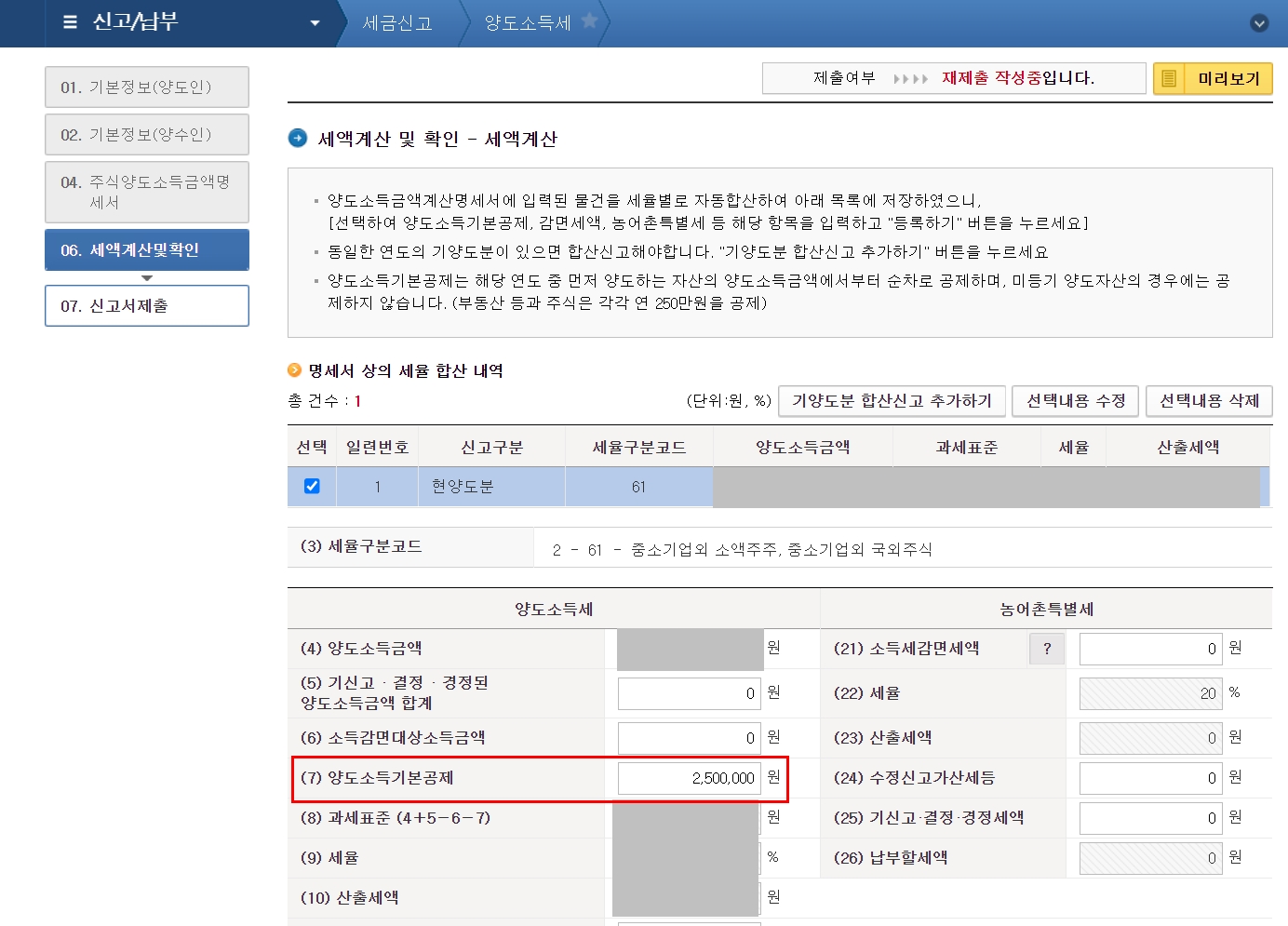 (8) 다음 창으로 넘어가 (7) 양도소득기본공제 금액에 250만원을 입력합니다.