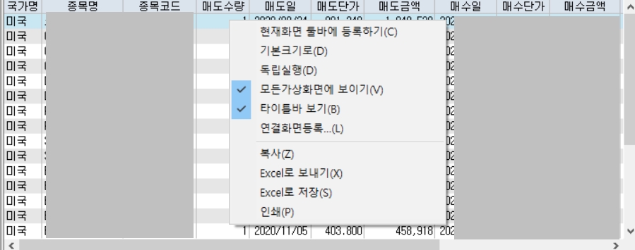 해외주식 양도소득세 조회 화면에서 마우스 오른쪽을 클릭하여 Excel로 보내기를 누르면 엑셀로 작년 매매내역을 받을 수 있습니다.