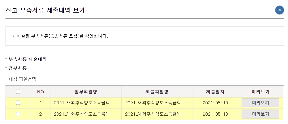 (5) 신고 부속서류 제출내역 보기에서 업로드 파일이 제대로 잘 올라갔는지 확인하고요.