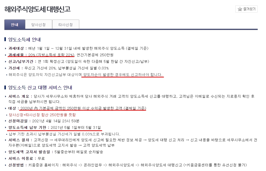 저도 키움증권에서 양도소득세 신고 대행신청을 하려고 보니 신청 기한이 끝났더라구요. 그것도 4월 중예요.