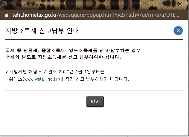 이렇게 팝업창이 자꾸 나오는데 그냥 닫으면 안돼요! 지방소득세를 별도로 신고해야 합니다.