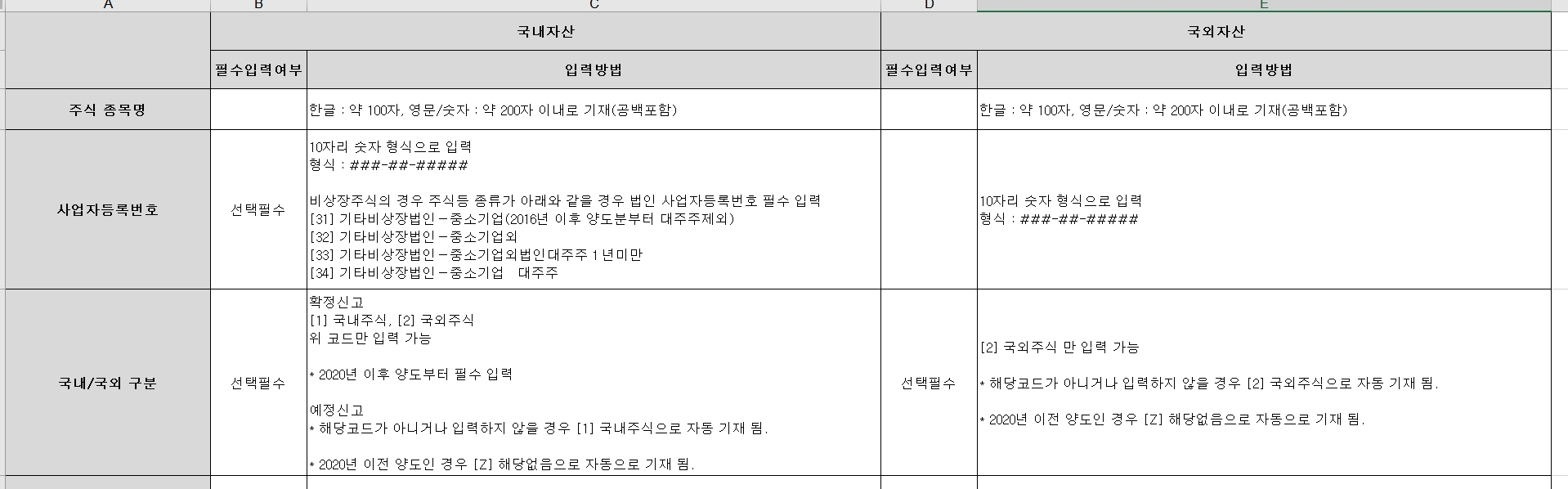홈택스에 업로드하는 양식에 맞춰진것이 아니고 키움증권의 양식대로 파일이 다운로드됩니다.