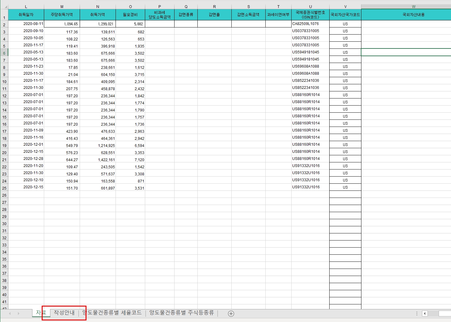 다시 홈택스에서 다운 받은 엑셀 시트로 가서 항목에 맞춰 입력합니다. 작성법은 엑셀 시트 '작성안내' 탭에서 확인할 수 있어요.