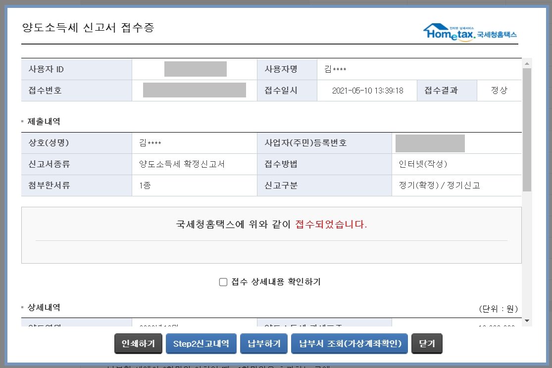 여기까지 홈택스에서 양도소득세 신고서를 제출하고 납부했습니다 :)