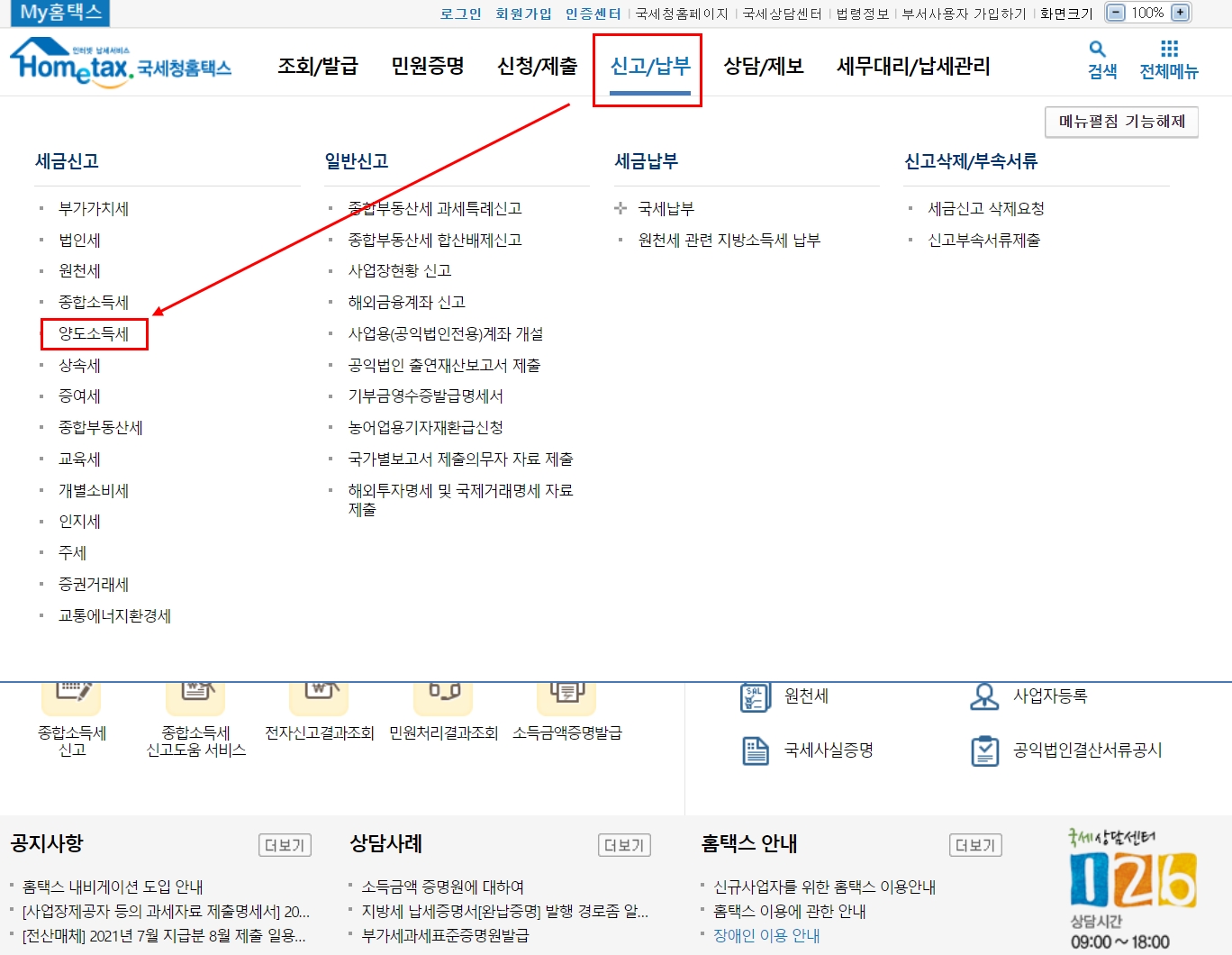 (1) 홈택스(www.hometax.com)에 접속해 로그인하고 신고/납부 메뉴의 양도소득세를 클릭합니다.