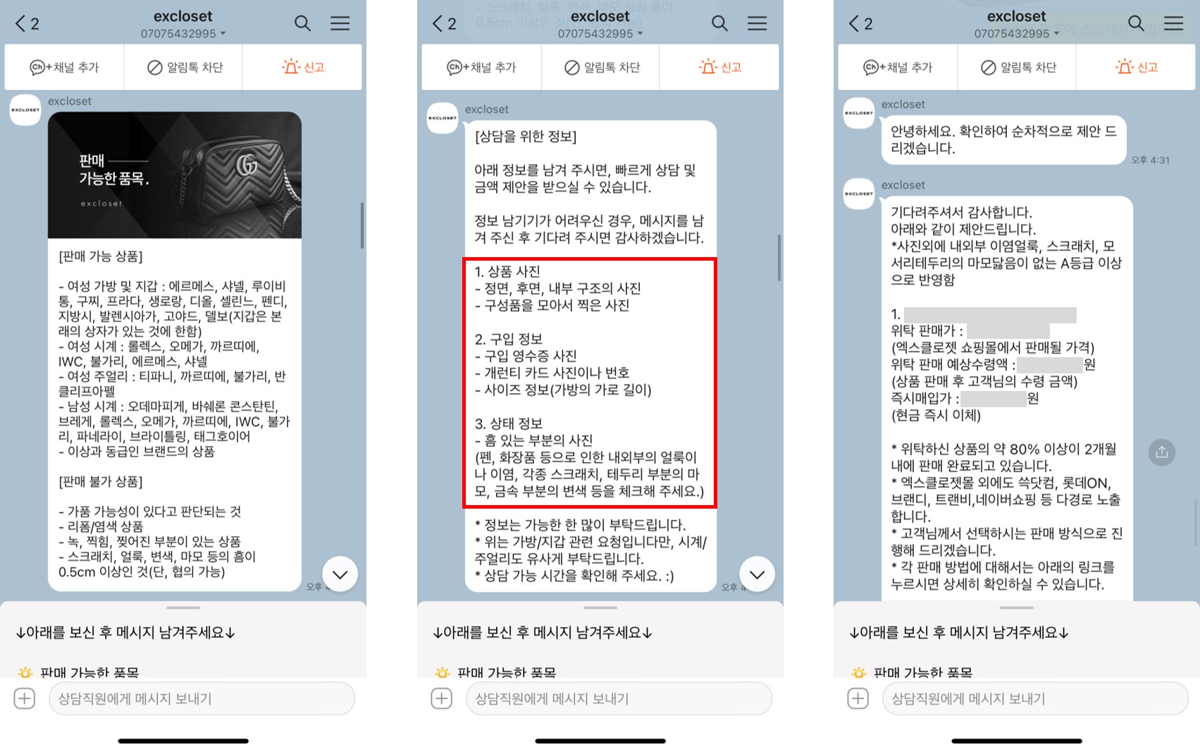 엑스클로젯은 10장정도 사진을 보낸데 반해 동네 명품샵은 1장의 사진으로만 견적을 받았기 때문에 차이가 좀 컸던 것 같아요.
