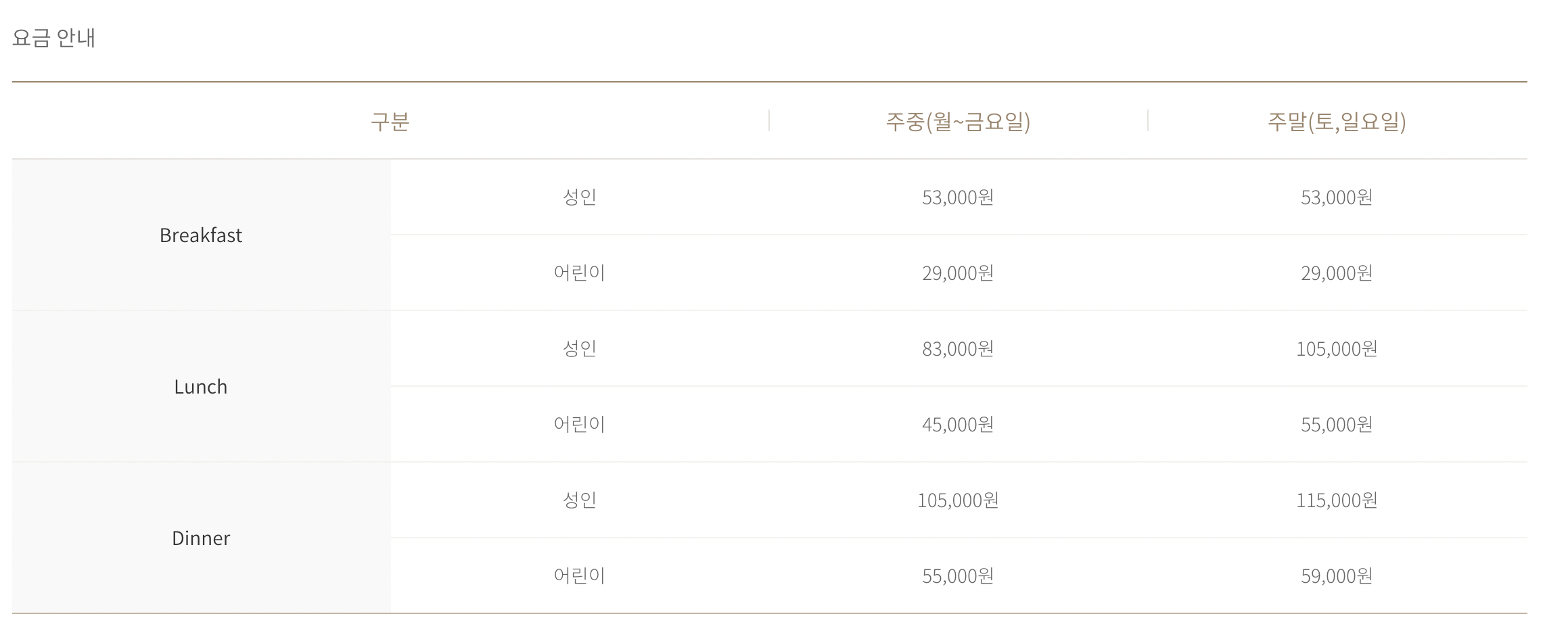 조식의 경우 주중, 주말 요금은 동일합니다.