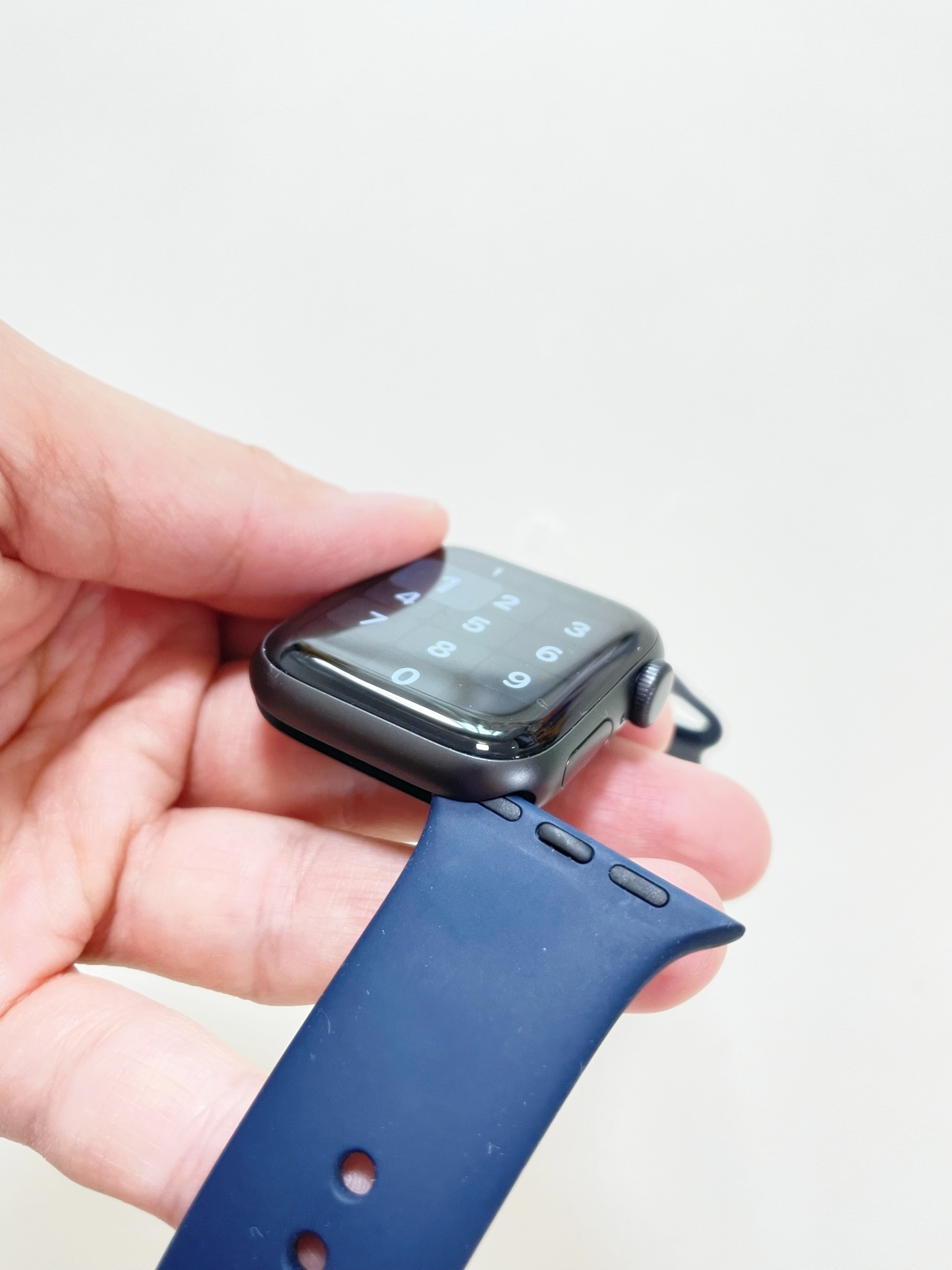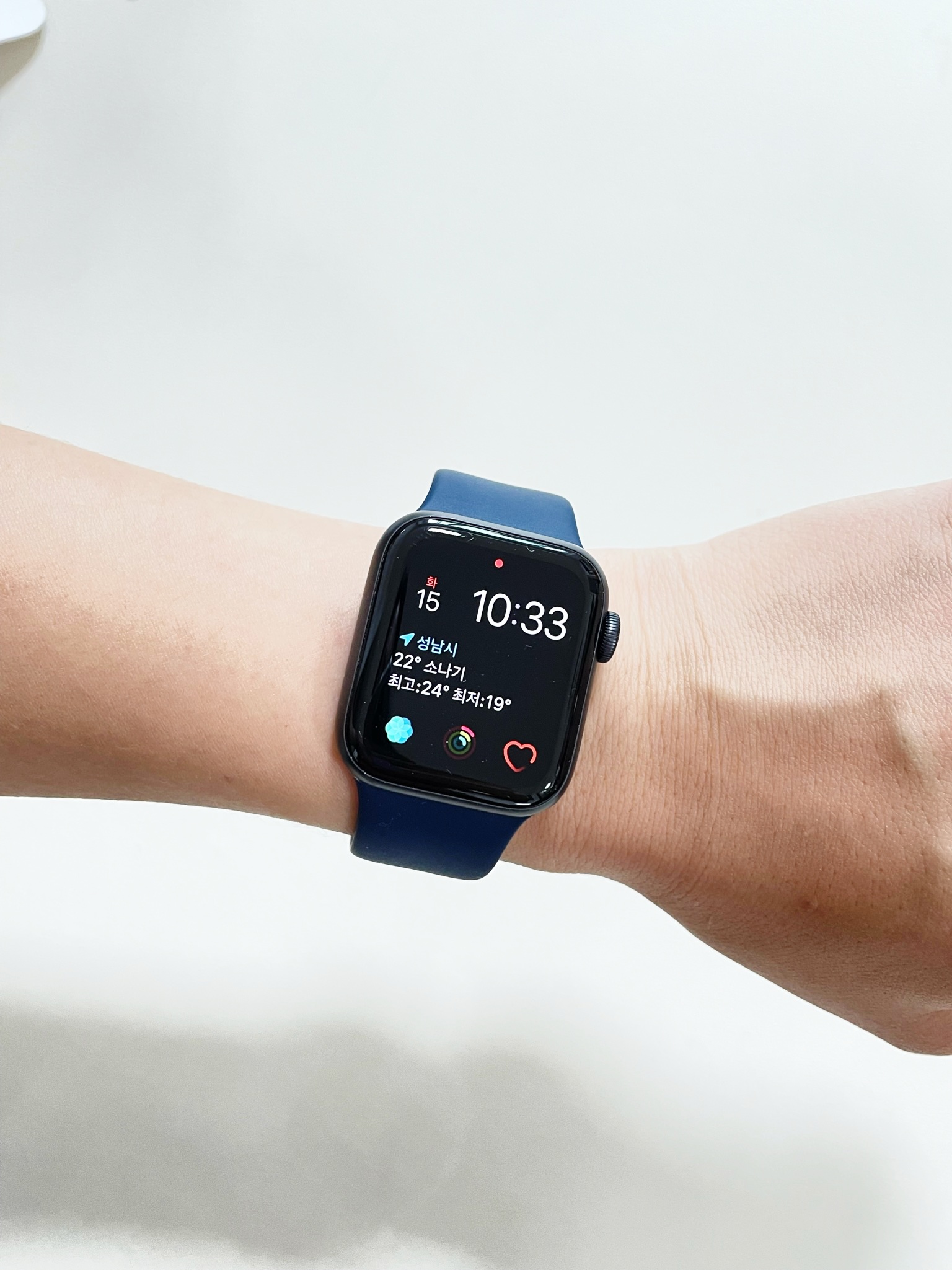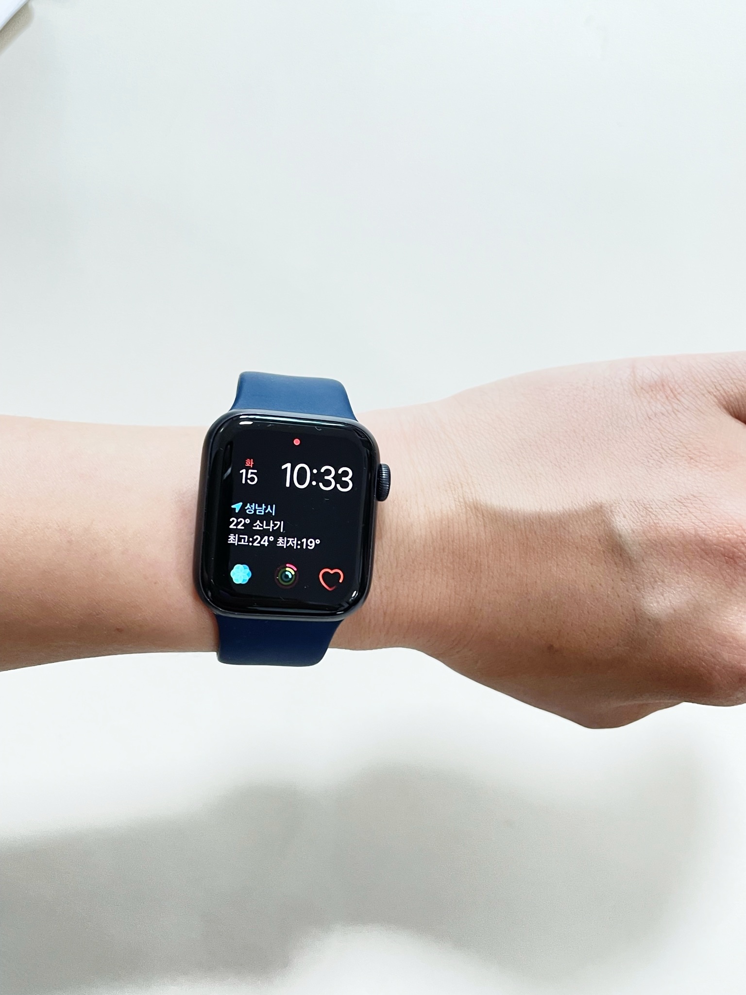 40mm 사이즈로 구입했는데요 제 손목은 얇은 편인라 조금 큰 듯한 느낌이 듭니다. 그래도 무게는 무겁지 않아서 착용 시 불편하지는 않아요. 사실 애플워치 구입 전에 미밴드5을 구입해서 사용했었는데요. 손목에 무언가를 찬다는게 불편하고 또 착용도 안하게 되어 애플워치 구입을 망설였는데요. 애플워치는 비싸서 그런지 잘때 빼고 쭉 잘 착용하고 있습니다.