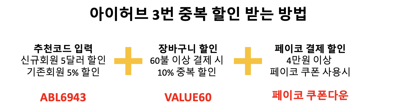 한국 택배가 오래걸리는 요즘 해외 직구 상품이 더 빠르게 도착하기도 해요. 국민직구사이트 아이허브 할인코드를 알려드릴게요. 아이허브는 쿠폰을 중복으로 적용할 수 있는데요. 아는 사람만 받는 할인 혜택인 만큼 중복 할인 혜택도 꼭꼭 챙겨보세요.