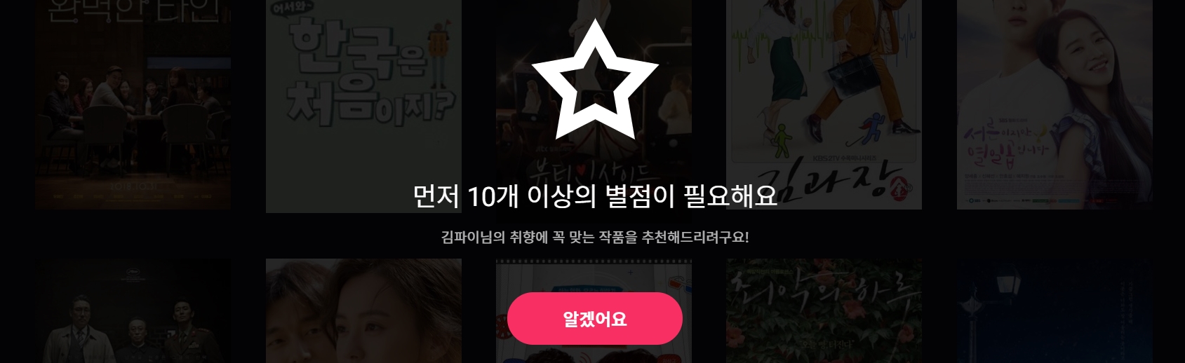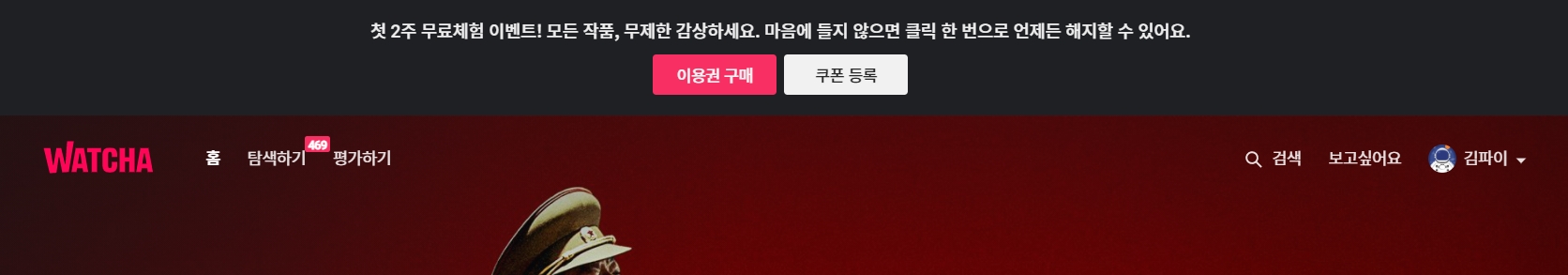 ② 영화 10개 이상 별점을 입력하면 메인화면 상단에 첫 2주 무료체험 이벤트 배너가 뜹니다.