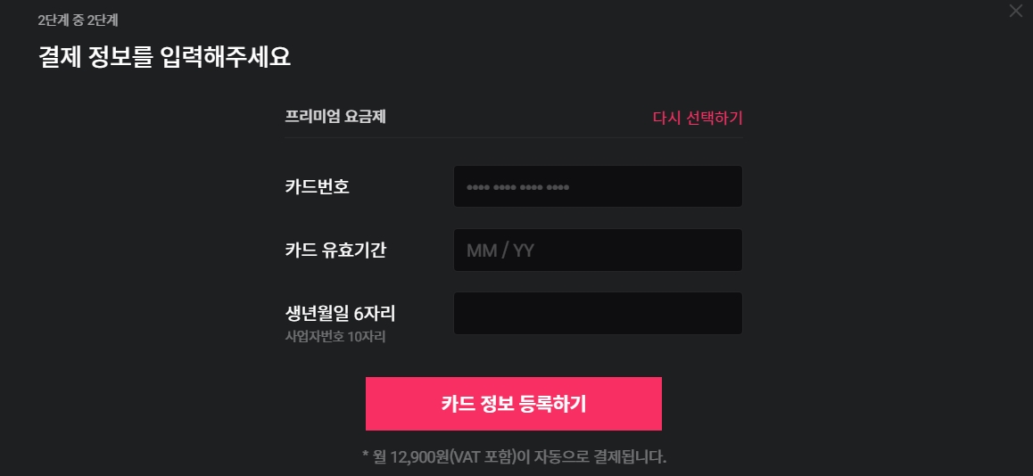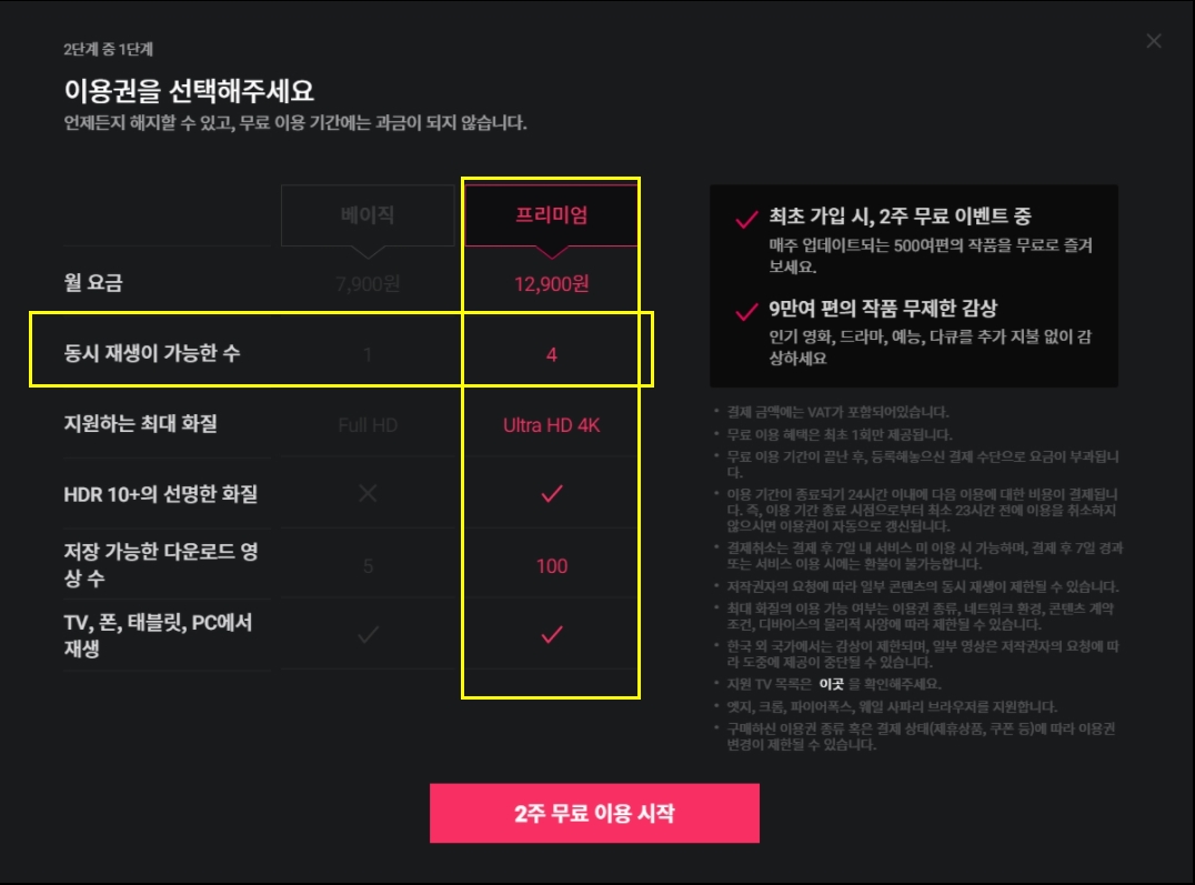 왓챠 멤버십은 베이직 7900원, 프리미엄 12900원 2 종류예요. 베이직은 동시재생이 불가능하고, 최대 화질이 Full HD이네 반해 프리미엄 이용시 동시 재생(동시 접속이) 4개까지 가능하고요, 최대화질도 Ultra HD 4K까지 지원합니다. 어차피 무료로 이용할 거기 때문에 프리미엄으로 선택해서 결제등록을 해보겠습니다. 4명이 프리미엄 왓챠 계정을 이용한다면 매달 3300원으로 왓챠 이용이 가능해요. 요즘은 뭉치면 요금이 저렴해지는 것 같아요.