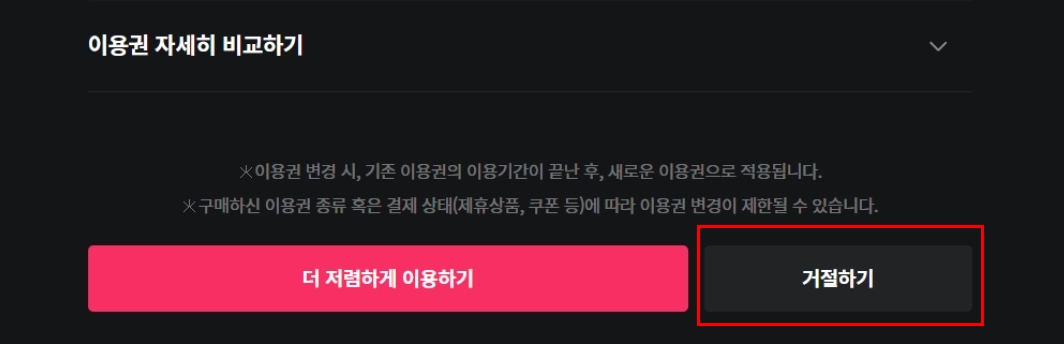 역시나 바로 해지를 할 수 없게 되어 있어요. 스크롤을 제일 밑으로 눌러 거절하기 버튼을 눌러줍니다.
