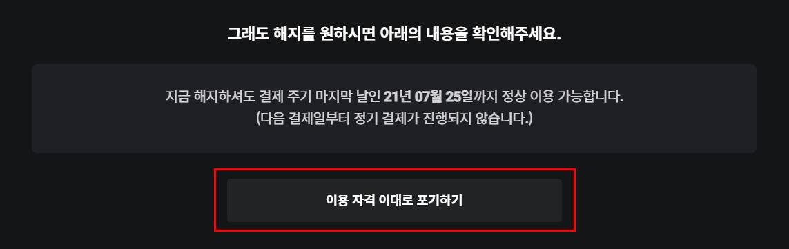③ 역시 스크롤 제일 아래로 내려가서 이용 자격 이대로 포기하기를 눌러줍니다.