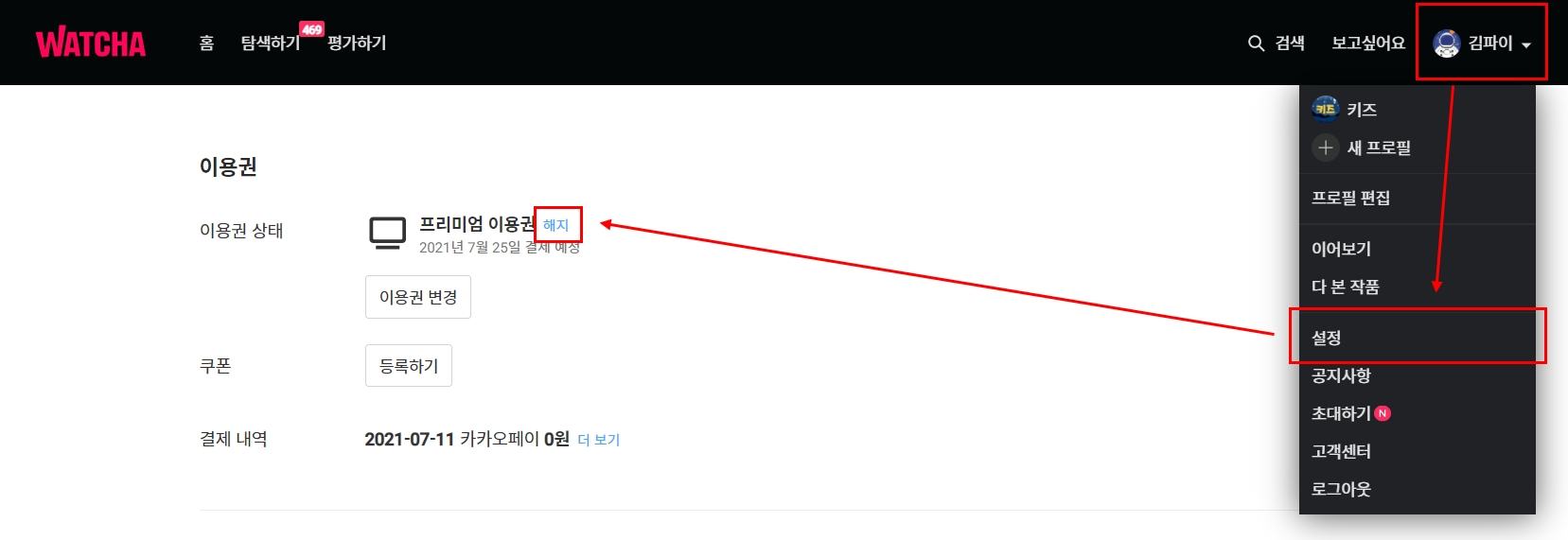 ①왓챠 계정으로 들어가 설정을 클릭한 후 이용권 해지 버튼을 클릭합니다.