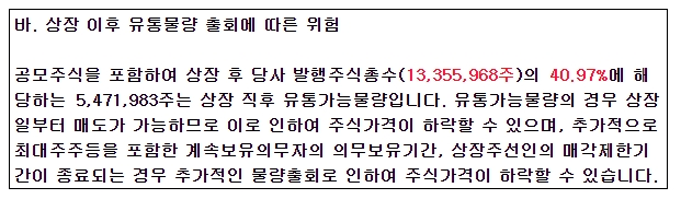 공모 주식을 포함하여 40.97%에 해당하는 물량이 상장 직후 유통가능합니다. 상장일 매도가 많이 일어날 경우 공모가 보다 주식이 떨어질 수도 있는 점 위험요소로 볼 수 있겠습니다.