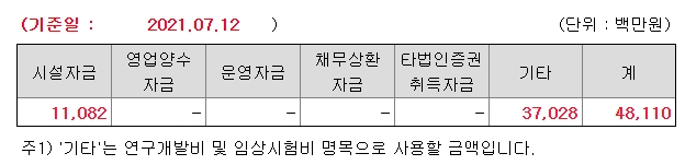 큐라클은 판교, 대전, 연세대 등 3개 연구소로 분리되어 운영 중인데요. 연구개발의 효율성 증대를 위해 수도권 일대에 신축 또는 연구 특화 단지에 입주하는데 사용됩니다. 연구시설의 통합 확충 및 소규모 생산시설을 확보하는 데 사용됩니다. 기타는 연구 개발비 및 임상시험비 명목으로 사용됩니다. 신약을 개발하는 회사이기 때문에 인력에 대한 투자로 볼 수 있겠습니다.