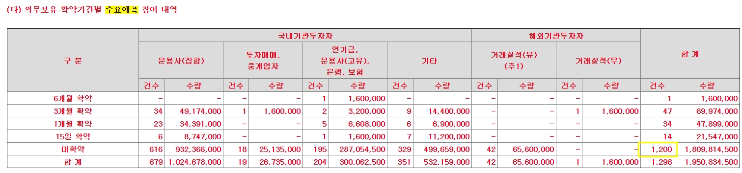 기관투자자가 의무보유 확약을 할 수록 더 많은 물량을 배정받을 수 있다고 해요. 수요예측 결과 92% 이상 대부분 미확약으로 신청했습니다. 수요예측에서 가격은 최상단으로 신청을 하고 의무보유 확약은 미확약으로 대부분 신청했네요.