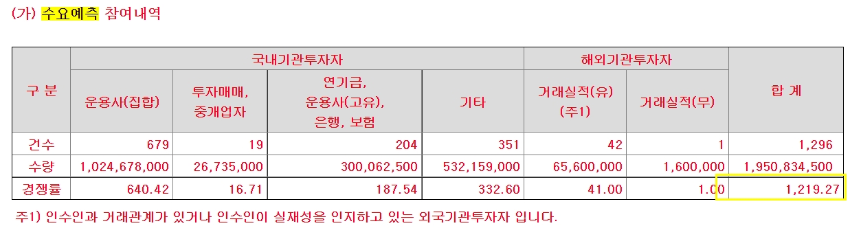 기관투자 수요예측 결과 1219대 1로 뜨거운 결과가 나왔습니다. 해외기관투자자 보다는 국내기관투자자의 관심을 받이 받았고요.