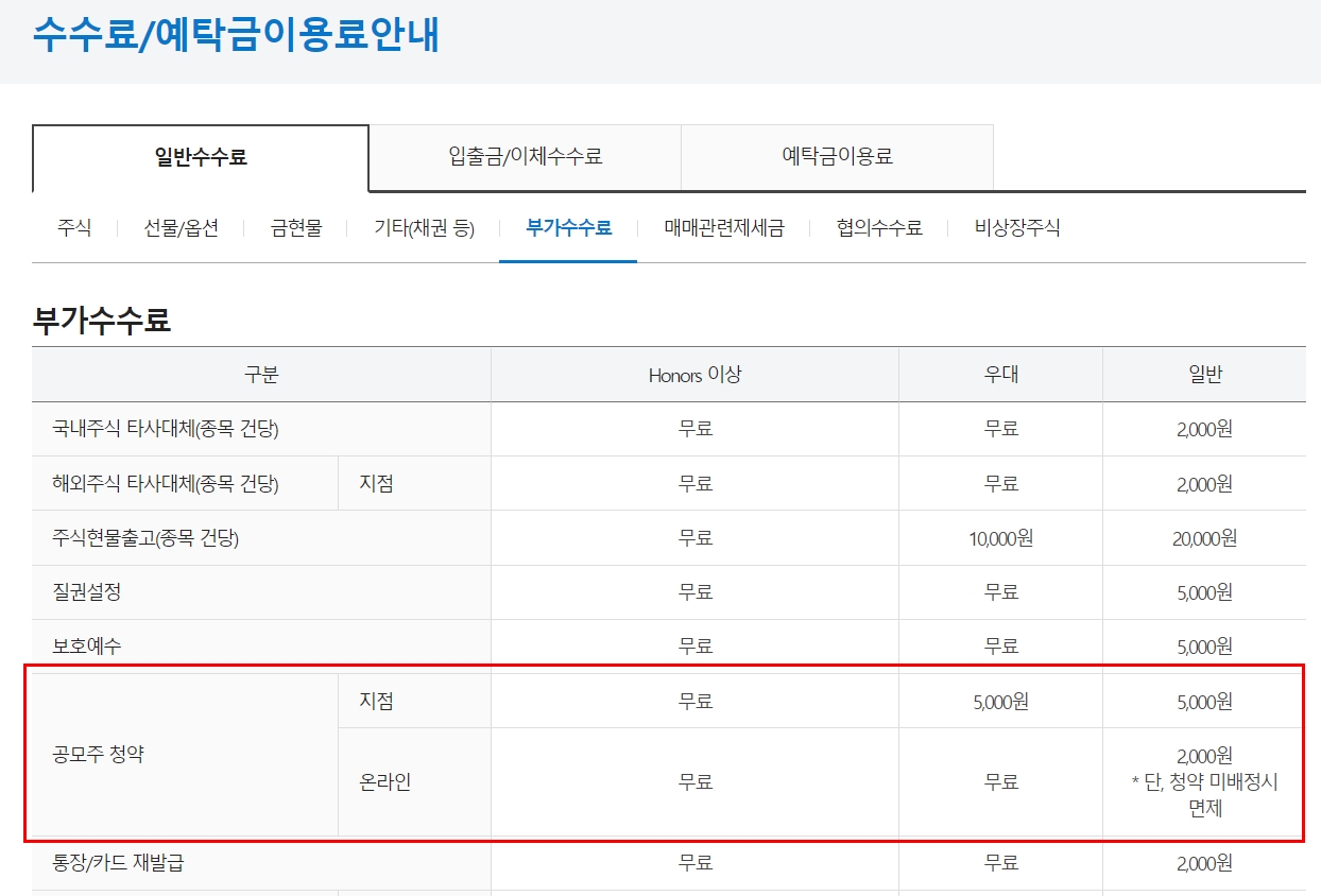 뿐만 아니라 증권사에 따라 공모주 청약시 수수료를 내야하는 곳이 있습니다. NH투자증권의 경우 글을 쓰는 현재 고객등급 무관 온라인 청약시 무료입니다. 삼성증권의 경우 고객 등급이 낮은 경우 온라인으로 청약을 하더라도 2000원의 수수료가 발생합니다. 예상치 못한 비용이 발생할 수 있으니 이 부분도 놓치지 마세요.